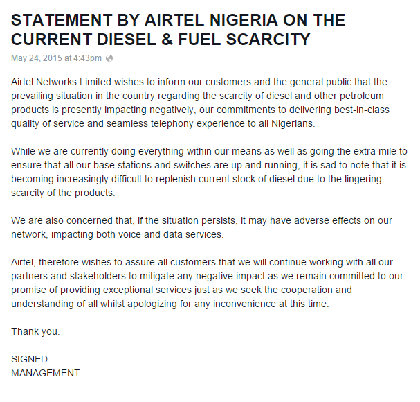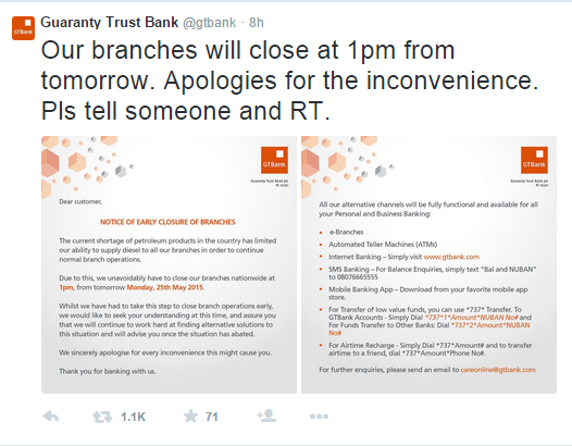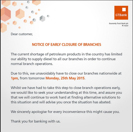 Now, GTbank has issued a statement stating plans to shutdown all branches from 1pm today, Monday, May 25, 2015 if fuel shortage continues while stating that all other alternative channels will remain fully functional.
