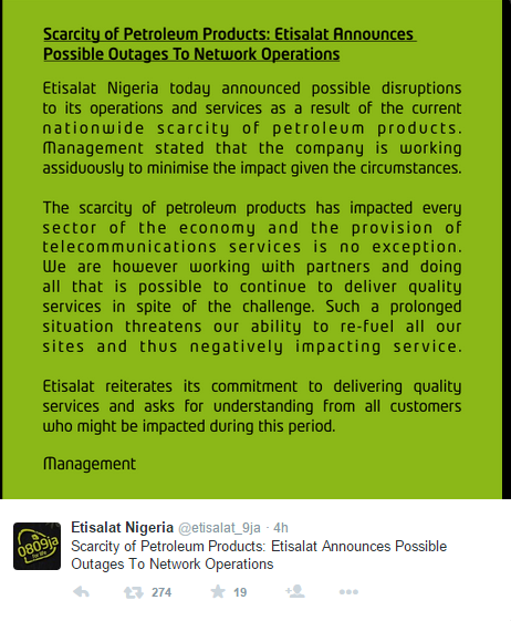 Telecoms service provider, Etisalat and airline operator, Aero Contractors have joined other top corporate bodies to announce possible disruptions in the quality of their services following the persistent scarcity of petroleum products in Nigeria.