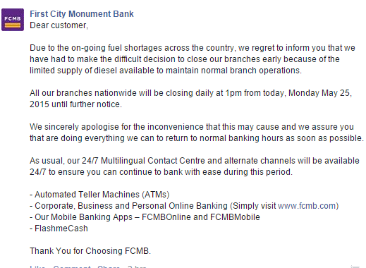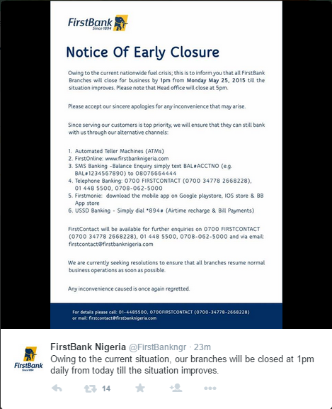 The current shortage of petroleum products in Nigeria is not improving and more banks have announced plans to shut down from 1pm on Monday, May 25, 2015.