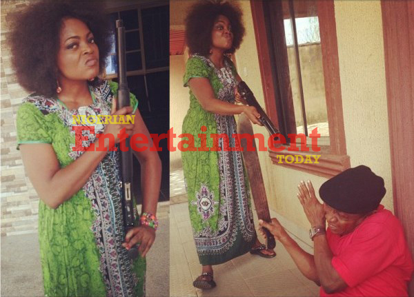 The movie also stars Amaechi Muonagor and ‘Mr Osiuofia’ Nkem Owoh whom Akindele is seen (above) pointing a double-barrelled shotgun at.