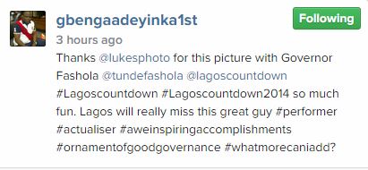 Gbenga put the picture with the caption: ‘Thanks @lukesphoto for this picture with Governor Fashola @tundefashola @lagoscountdown #Lagoscountdown #Lagoscountdown2014 so much fun. Lagos will really miss this great guy #performer #actualiser #aweinspiringaccomplishments #ornamentofgoodgovernance #whatmorecaniadd?’