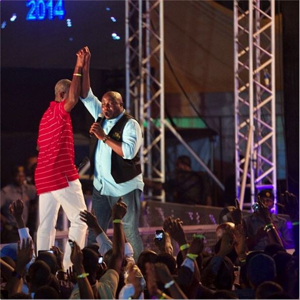 Popular comedian and Master-of-Ceremonies, Gbenga Adeyinka The 1st posted this picture on Instagram of himself and his special guest of honour on stage, Governor Babatunde Fashola at the recently-concluded Lagos Countdown Concert 2014 held at the Bar Beach, Victoria Island, Lagos.