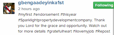 Adeyinka shared the good news on Instagram with the caption: ‘#myfirst #endorsement #thisyear #Sparklightpropertydevelopmentcompany. Thank you Lord for the grace and opportunity. Watch out for more details #gratefulheart #ilovemyjob.’