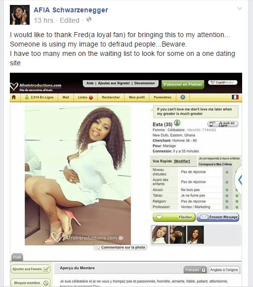 According to Afia, who recently moved to Kasapa 102.3 FM after quitting her role at Happy FM, a fan called her attention to the fact that someone is using her name and picture to defraud people online.