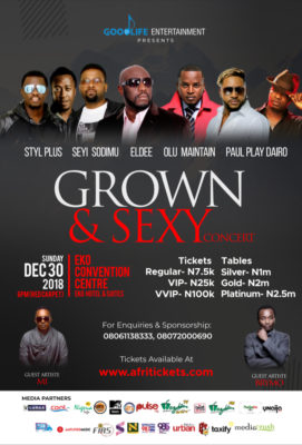 With the likes of StylPlus, Eldee, Olu Maintain, Seyi Sodimu, PaulPlayDairo and so many others taking the stage, the Grown & Sexy Concert put together by Goodlife Entertainment promises to be an amazing night of good music for all music lovers.