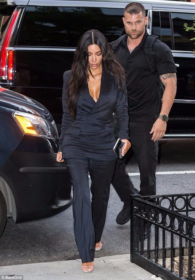 The buff bodyguard held the door open for Kim as he placed his hand very low on her to guide her into the building.