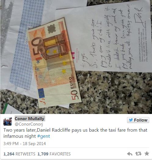 British actor, Daniel Radcliffe, has paid back the cab fare of (€50.oo) loaned to him two years ago by a group of Irish athletes.