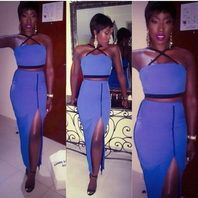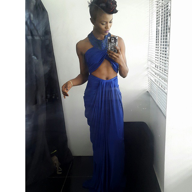 Taking a sneak peek, Eva, who was nominated in the Best Rap category, was all wrapped up in this lovely blue dress which reveals her well trimmed abs. The dress is designed by one of Nigeria’s own, Ejiro Amos Tafiri.