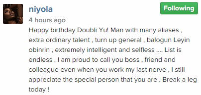 Not left out is the first lady of E.M.E, Niyola who has been romantically linked with Banky W in the past. Even though both parties have denied dating, the pretty singer had some sweet words for Banky W on his birthday.