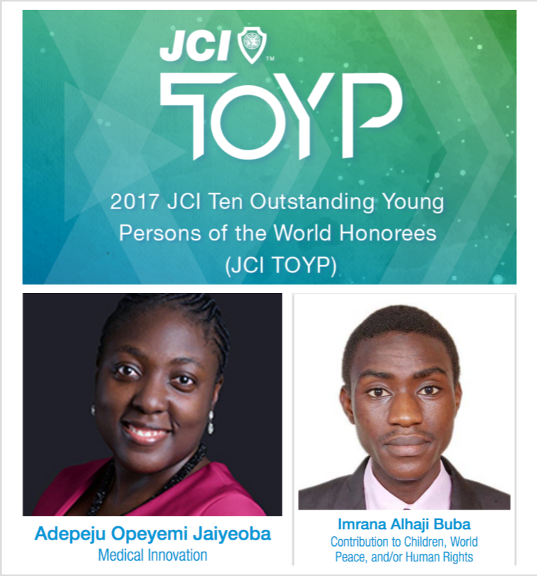 World youth organisation, Junior Chamber International has announced two Nigerian under-40s, Imrana Alhaji Buba and Adepeju Opeyemi Jaiyeoba as top 20 finalists in its global selection of 10 Outstanding Young Persons of the Year (JCI TOYP) 2017.