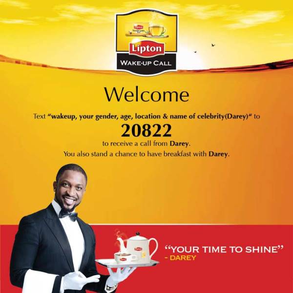 All you need to do? Text ‘Wake up, your gender, age, location and name of celebrity’ to 20822 and get a call from Darey or any your favourite Lipton Tea celebrity!