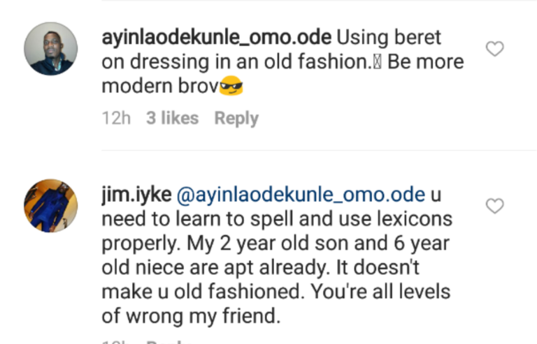 A fan decided to advise the style Icon saying berets were old fashioned. Jim Iyke then replied the fan saying: