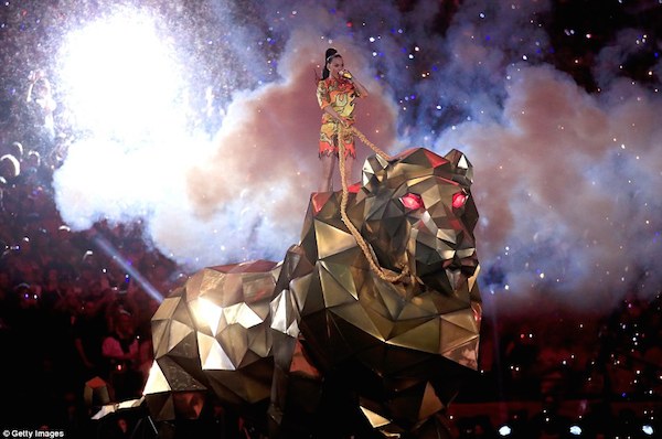 Katy Perry kicked off her Super Bowl half-time performance riding a giant tiger last night, February 1, 2015.