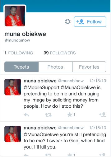 As far back as December 15, 2013, an obviously angry Muna had taken to Twitter first to threaten the impostor in a bid to get him (or her – crime is not limited to men alone nah!) to stop, and to also warn his followers and fans about the fake account: @MunaObiekwe.