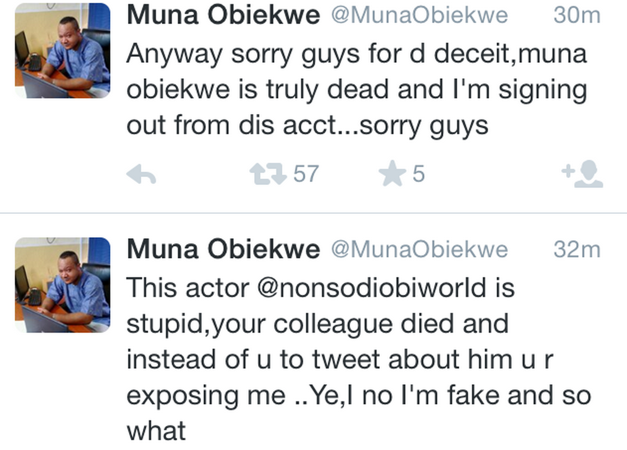 Unfortunately, his efforts proved abortive and with the late controversial actor totally inactive on Twitter, the impostor continued unhindered until Muna’s untimely demise on Sunday.