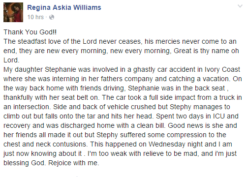 Akwa-Ibom State-born Imaobong Regina Askia, is full of praises to the heavens at present based on her daughter’s miraculous escape from a ghastly car crash in far away Ivory Coast.