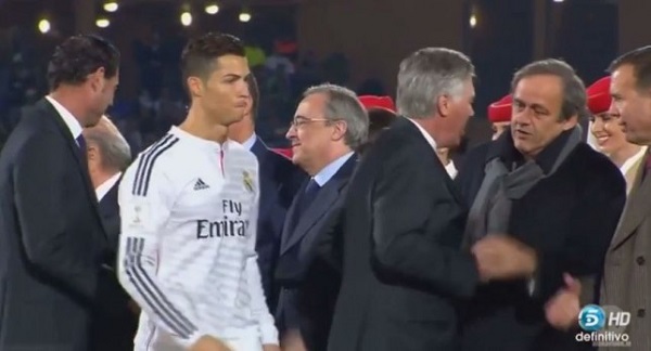 And during the presentation of the Club World Cup title to Real Madrid last Saturday, December 20, 2014, the former Manchester United star footballer walked past the president after his coach, Carlo Ancelotti and others were seen exchanging pleasantries with Mancini and other football dignitaries.