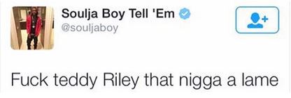 Soulja is obviously pissed with Teddy over the circumstances surrounding the break up from Nia Riley as he tweeted and later deleted a post saying, ‘F*ck Teddy Riley that nigga a lame’.