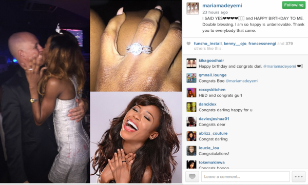 Mariam who celebrated her birthday, yesterday, Sunday 21 December 2014, was treated to a surprise party where she was later proposed to by her boyfriend. The P.R executive posted pictures of her engagement ring and birthday on Instagram.