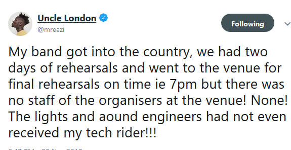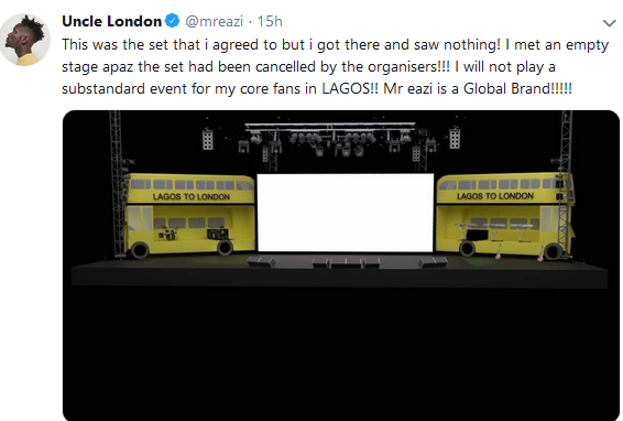 But in a series of tweets, Mr Eazi has told his own side of the story, saying he cancelled the event due to lack of confidence in the delivery. The ‘Skin Tight’ singer said he got to the event centre and was not satisfied with the arrangements on ground. He complained that the stage met there was different from what he had asked for. He also said that the ground staff who were supposed to make sure that things went smoothly during their final rehearsals did not arrive at 7pm as scheduled and his