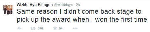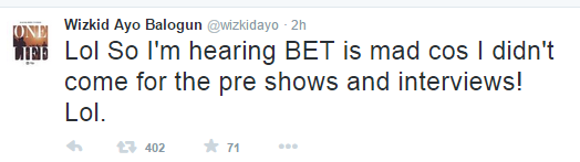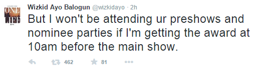 While others slammed the award organisers for disrespecting African acts by handing them awards backstage hours before the main show starts, Wizkid has politely explained his reason for not showing up for the pre-show parties and interviews for the 2015 edition.