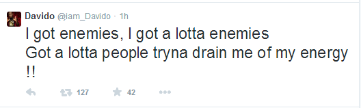 Davido, who is currently working on his sophomore album didn’t however reveal who his enemies are and taking another critical look at his post, he might be trying to intimate his fans with the lyrics of a new song.