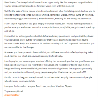 April 10, 2018. Fast forward to three years later. I got a Whatsapp message from my colleague that read; “Hi Victor, quick one, would you be interested in interviewing Skales?” My heart skipped. It felt like being reminded of your ex. I wasn’t sure of what response to give. You ask why? The answer is… I don’t know. I didn’t know how to feel about that. Alas, I responded “Yeah I would”. We scheduled with his handlers and three days later, he showed up.
