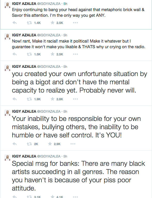 The 24-year old rapper took to her Twitter account to slam the 23-year-old star for ‘bullying others’ after Azealia insisted on Thursday, December 18, 2014 that Iggy’s music was ‘not excellent’ enough for Grammy recognition after she was nominated in the Record of the Year category for her hit, ‘Fancy’.