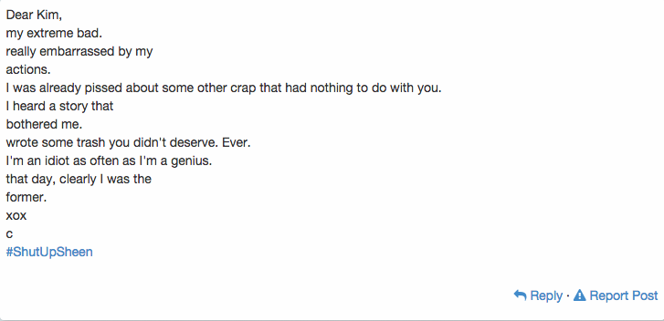 He wrote: ‘Dear Kim, my extreme bad. really embarrassed by my actions. I was already p***ed about some other c**p that had nothing to do with you. I heard a story that bothered me. wrote some trash you didn’t deserve. Ever. I’m an idiot as often as I’m a genius. that day, clearly I was the former. xox’