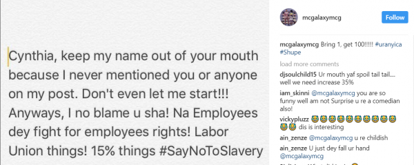 Cynthia Morgan has come at MC Galaxy again in a brief Twitter rant as the recent feud between the two musicians lingers on.
