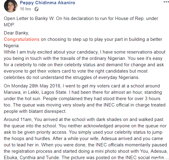 A business consultant, Peppy Chidinma Akaniro, recently called out Nigerian singer, Banky W, in an open letter shortly after he declared his intention to join politics.