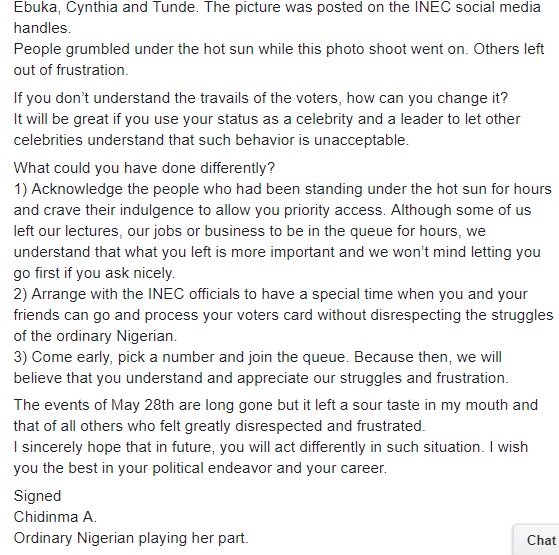 In the letter shared on her Facebook page, Akaniro accused him of skipping the queue with his wife Adesua Etomi, and friends Tunde Demuren, Ebuka Obi-Uchendu and his wife Cynthia during the INEC voters’ registration exercise.