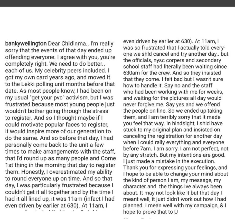 Taking nothing for granted, the intending politician has taken time to pen an apology to Chidinma saying he is sorry his actions offended everyone and also agreeing that he should have done things differently. He took time to explain the circumstances that led to the incident adding that he made a mistake and is not perfect.