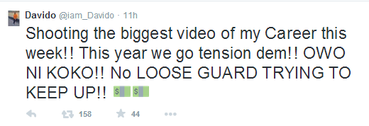Currently in the United States, Davido is once again teaming up with Sesan Ogunro to shoot another video for a song off his forthcoming album and this time Davido says it’ll be the biggest video of his career. In a tweet some hours ago, he said: ‘Shooting the biggest video of my career this week! This year we go tension dem!! OWO NI KOKO!! No LOOSE GUARD TRYING TO KEEP UP.’