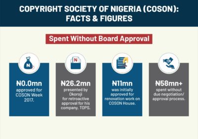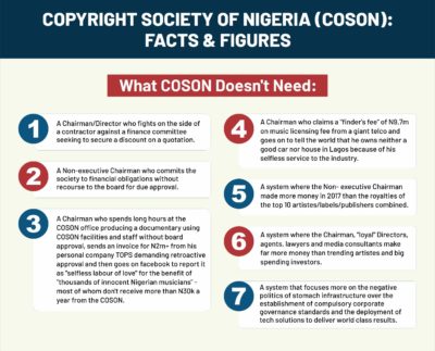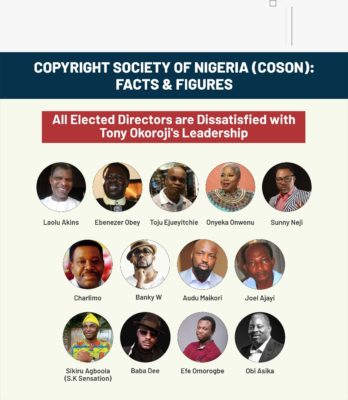 In the wake of the dissolution of COSON’s right as the collective administrator of the Nigerian music industry by the NCC, an infographic has surfaced citing the stance of directors of the organisation’s board in regards to the performance of COSON’s embattled chairman; Chief Tony Okoroji.