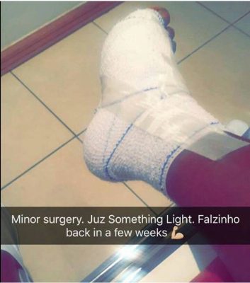The rapper cum comedian on his Snapchat captioned a snap of his leg wrapped in a bandage ‘Minor surgery, just something light. Falzinho back in a few weeks.’