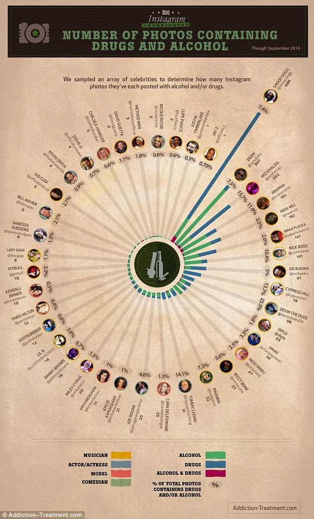 He was also revealed to have posted more references to drugs and alcohol than any other celebrity, with fellow rapper, P. Diddy coming a close second.