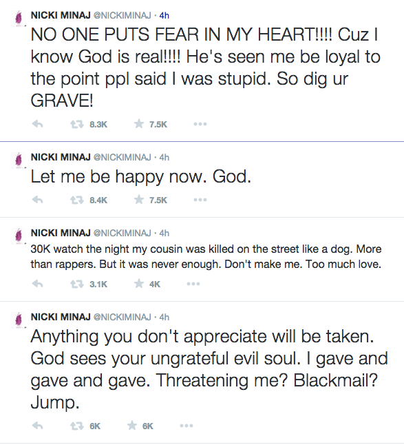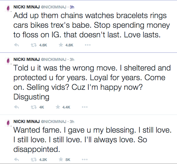 She has however always tried to keep their relationship out of the spotlight but it looks like that has changed. With revealing song lyrics and now a Twitter rant, people are getting a closer look at what has been Nicki Minaj’s love life.