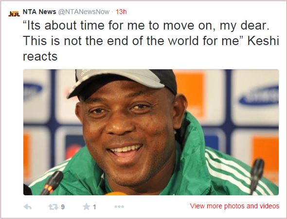 ‘Its about time for me to move on, my dear. This is not the end of the world for me,’ Keshi, who had said he was not bothered by being sacked said.