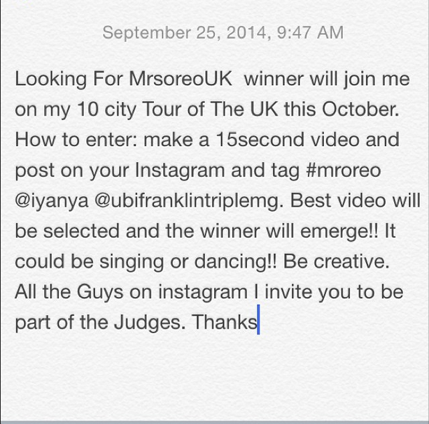 Nigeria’s afropop singer, Iyanya, who rose to fame with the hit-track ‘Kukere’ has created a new competition on Instagram, with the purpose being to search for Mrs Oreo UK.