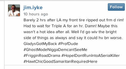Jim shared a picture of the car on his Instagram page with the caption: ‘Barely 2 hrs after LA my front tire ripped out frm d rim! Had to wait for Triple A for an hr. Damn! Maybe this wasn’t a hot idea after all. Well I’d go wiv the bright side of things as always and say it could be worst. #GladysGotMyBack #ProfDude #GhostModeNiggaDemcantSeeMe.’
