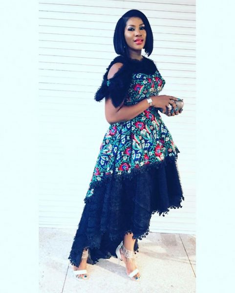 The Ghanaian actress paired the dress with blue velvet heels, silver clutch and drop earrings.