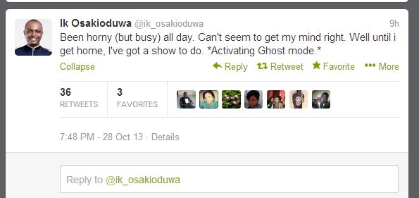 ‘Been horny (but busy) all day. Can’t seem to get my mind right. Well until i get home, I’ve got a show to do. *Activating Ghost mode.*‘, @ik_osakioduwa wrote, shocking us a little bit.