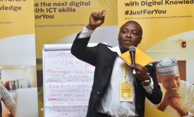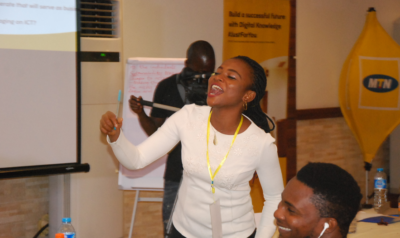 Trainees working through tasks at the MTN Foundation ICT and Business Skills Training recently A trainee presenting during the training session
