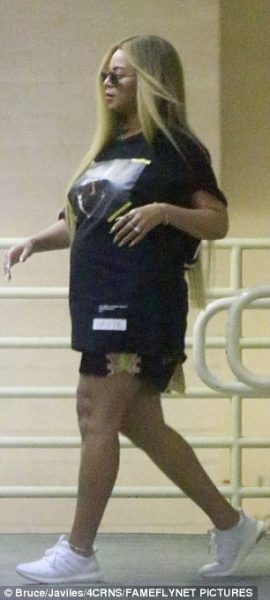 Beyonce gently clutched her bulging belly as she stepped out for a shopping spree in Beverly Hills earlier today.