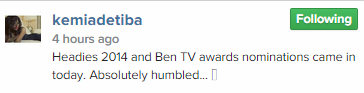 At the nominations event held for the Headies, which comes up on October 25, Kemi Adetiba was nominated in the Best Music Video director alongside Clarence peters, AJE, Unlimited L.A and Jude Okoye while she got nomination for the Music Video Director of the year at the Ben TV awards in the UK.