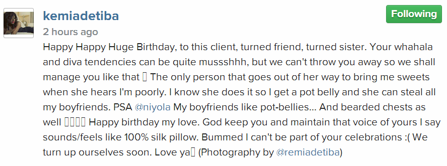 Kemi wrote: ‘Happy Happy Huge Birthday, to this client, turned friend, turned sister. Your whahala and diva tendencies can be quite mussshhh, but we can’t throw you away so we shall manage you like that. The only person that goes out of her way to bring me sweets when she hears I’m poorly. I know she does it so I get a pot belly and she can steal all my boyfriends. PSA @niyola my boyfriends like pot-bellies… And bearded chests as well. Happy birthday my love. God keep you and maintain that voice of yours I say sounds/feels like 100% silk pillow. Bummed I can’t be part of your celebrations (We turn up ourselves soon. Love ya).’