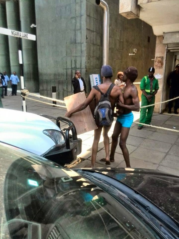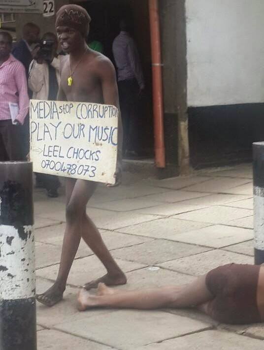 Upcoming Kenyan rapper, Leel Chocks, has caused a huge scene on the streets of Ngamai lane after stripping down to his pant over the lack of airplay on media platforms in the country.