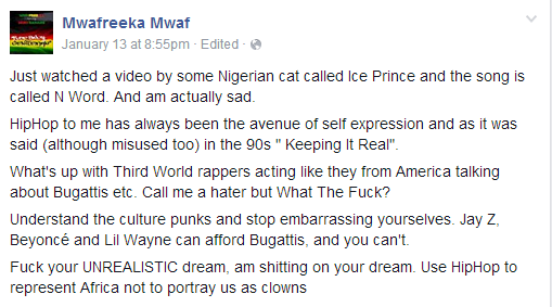 The Kenyan rapper took to Facebook to rant, saying: ‘Just watched a video by some Nigerian cat called Ice Prince and the song is called N Word. And am actually sad. HipHop to me has always been the avenue of self expression and as it was said (although misused too) in the 90s ‘Keeping It Real’. What’s up with Third World rappers acting like they from America talking about Bugattis etc. Call me a hater but What The F..k?