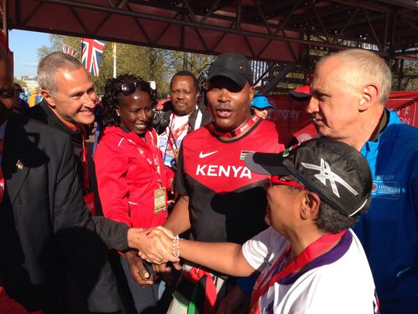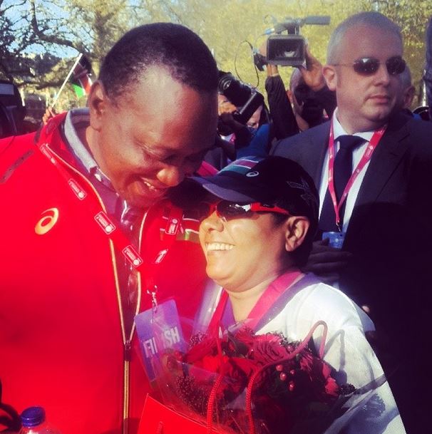 - Kenyan president Uhuru kenyatta congratulates his wife with a warm hug after the race.